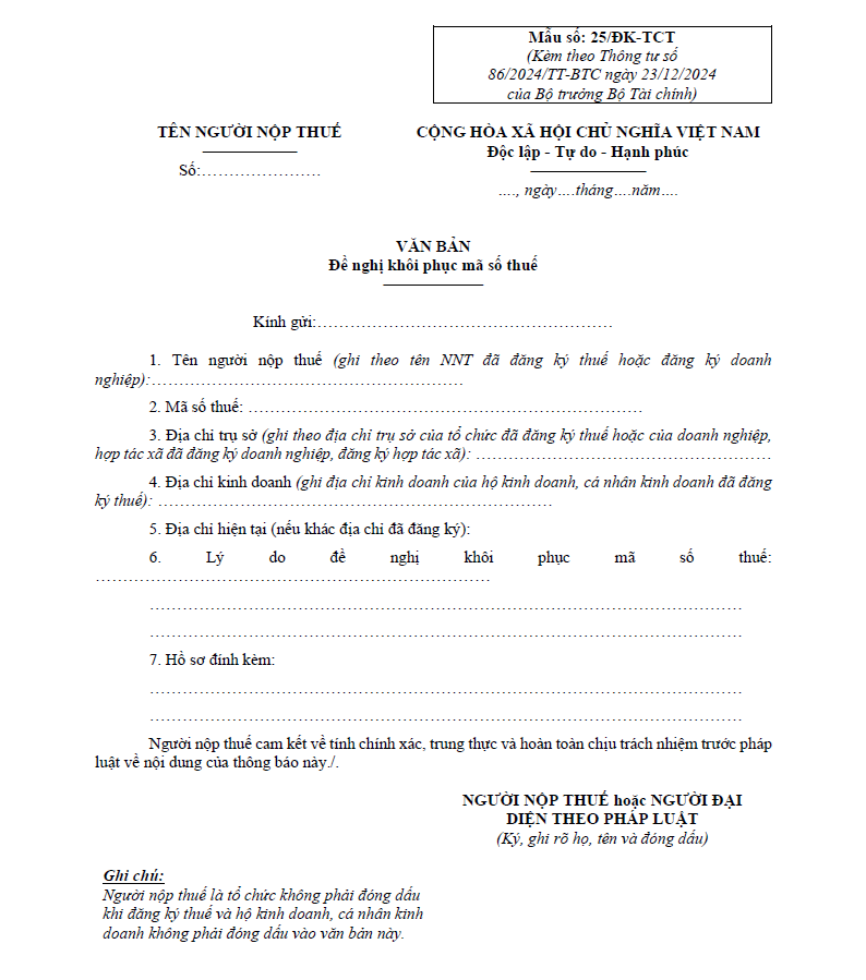 - Đơn đề nghị khôi phục MST (Mẫu 25/ĐK-TCT)